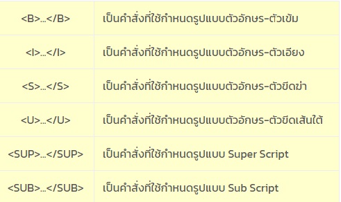 ของแบบตัวอักษร, การกำหนดขนาดตัวอักษร,การใช้อักขระพิเศษ,และการกำหนดสี ซึ่งมีแท็กคำสั่งต่างๆ ดังต่อไปนี้