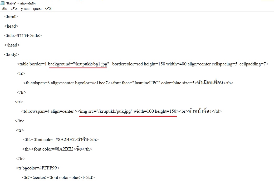 ตัวอย่างการใส่ภาพพื้นหลังและภาพในตาราง